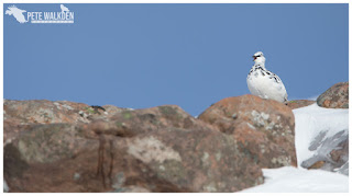 The ptarmigan seemed pretty wary and we wondered if we might have just missed an eagle passing overhead before our arrival. Unlike us, the ptarmigan could cover the snow very quickly, and even more so when it flew a small distance away to some more rocks. However, as we started to close the gap once more, it became clear that it had strayed into a rival's territory, and in flew the owner, pausing at the top of the ridge above us to call out, before chasing off the trespasser just out of sight of us. By the time we'd climbed the hill, both birds had cleared off!
