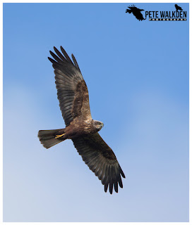 It wasn't long before one of the marsh harriers, a male, lifted out of the reeds, but he was a smidge far off for taking photos. After circling high up, he then went into a stooping dive, much like the goshawks I'd watched earlier this year, though this was far more impressive, as he went much higher and repeated the display several times. Wonderful to watch.