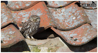 Another cloudless morning followed, and again I caught up with the little owl, who was either stretching or perhaps breaking wind, when I spotted it on the roof.