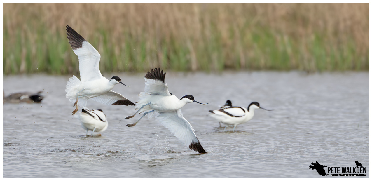 When the spoonbill flew further into the marshes, away from any pathways, I had to give up the pursuit, and head round the route back to the car, and a very patient father, who was sitting enjoying some spring sunshine on a bench. On the way I stopped beside a small pool to photograph a group of avocets, and enjoyed their antics as they chased each other, running and splashing through the water, occasionally taking flight.