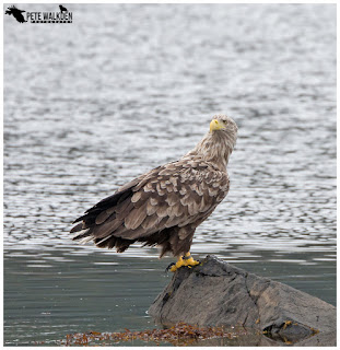 Driving slowly past, as I had to turn around to park up safely, I crossed my fingers that the eagle wouldn't be spooked by the car, and that was when I saw the other one. Sat in the water, just a few metres from the one on the rock. Wow. Thankfully my luck held out, and neither flew off when the car's ignition was switched off, and I pointed the camera at them. I grabbed images of them individually, but couldn't believe my fortune when the one that had been paddling in the shallows, took off and joined the other on the rock. Dreams are made of stuff like this! Perched beside one another, the difference in size between genders was clear to see.