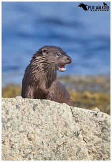 Crouching down, back resting against a rock to hide my shape, I waited, and waited for the otter to appear where I expected it to. It didn't. Instead, it climbed on to one of the rocks I was using for cover, and stopped in its tracks when it looked over the top and down at me. There was a moment of surprise for both of us, and knowing full well the otter had seen me, I grabbed a couple of shots.