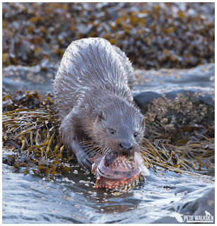 After views of the family catching and eating prey, they headed out into the loch, and we had to relocate to watch them. I chose a lofty position on some rocks, whereas Andy dropped down to water-level. A cub caught us pretty much on the hop, bringing in a fish right below me, and started to play with it in a small rock pool. Far too busy with that to notice me watching from above... unlike the dog otter that arrived without warning. He spotted me immediately, and paused as he approached the cub, presumably to steal its catch. That pause was enough for the cub to realise what was going on, and call out to its mother.